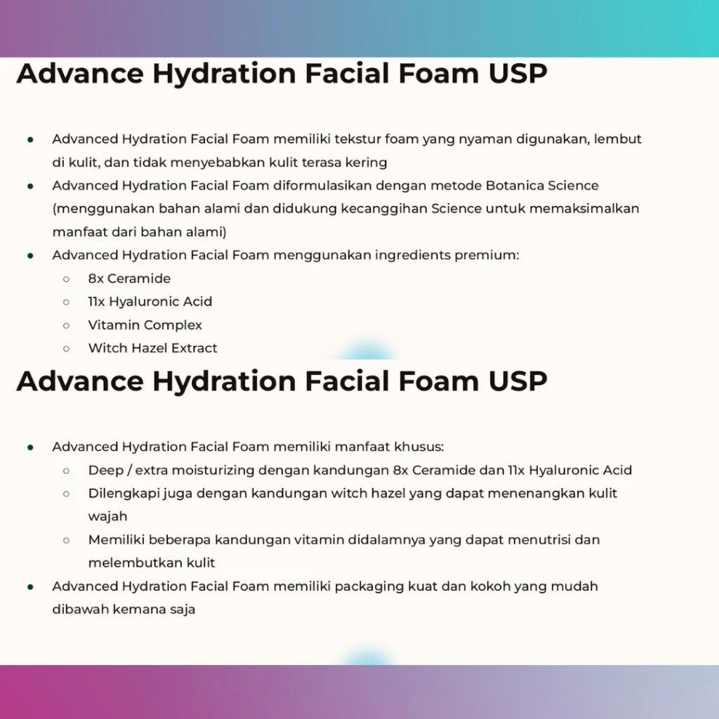 Digunakan mulai dari usia remaja hingga dewasa. Cocok untuk yang mengalami keluhan kulit sangat kering, skin barrier, dan sensitive bahkan kemerahan sekalipun karena telah melalui dermatolgy tested dan hypoallergic serta diperkaya dengan 5 natural ingredients yang fokus untuk merawat concern kulit tersebut. 3. ADVANCE HYDRATION FACIAL FOAM Rp. 99.000 Netto: 100ml BPOM: NA 18231207954 Hero Ingridients: 8x Ceramide, 11x Hyaluronic Acid, Vitamin Complex, Witch Hazel Extract Manfaat Produk: • Membersihkan kulit dengan lembab, tanpa membuat kulit kering dan ketarik • Melembabkan dan menghidrasi kulit • Menutrisi Kulit • Menenangkan kulit • Aman Untuk Kulit Sensitif Cara Penggunaan: 1. Basahi wajah terlebih dahulu, lalu tuangkan Reglow Advanced Hydration Facial Foam secukupnya pada telapak tangan. 2. Usap di wajah secara perlahan dengan gerakanmemutar. Lalu bilas dengan air bersih. 3. Untuk hasil yang lebih maksimal gunakan dua kali dalam sehari pada pagi dan malam hari bersamaan dengan rangkaian Reglow Skin Barrier Series lainnya. Digunakan mulai dari usia remaja hingga dewasa. Cocok untuk yang mengalami keluhan kulit sangat kering, skin barrier rusak, dan sensitive bahkan kemerahan sekalipun karena sudah melalui dermatology tested dan hypoallergenic.
